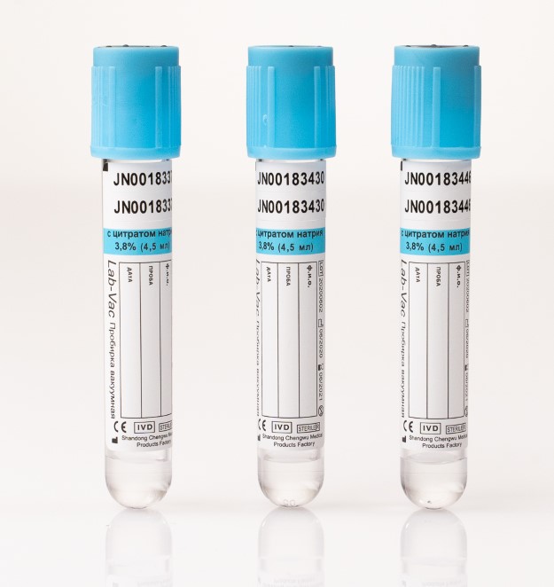 Пробирки содержат 3,8% цитрат Na (0,129 моль/л). Соотношение крови и реагента 9:1.