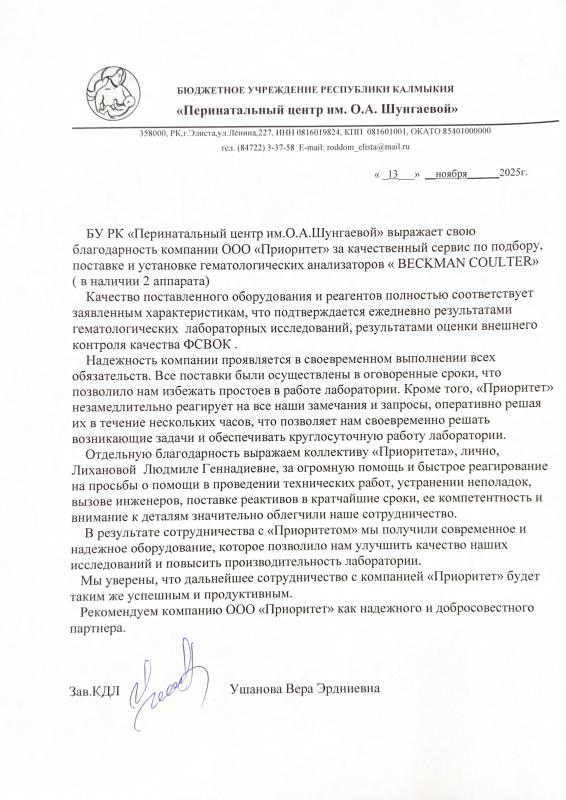 Благодарственное письмо БУ РК Перинатальный центр им. Шунгаевой