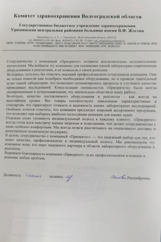 Благодарственное письмо ГБУЗ "Урюпинская ЦРБ им. Жогова"