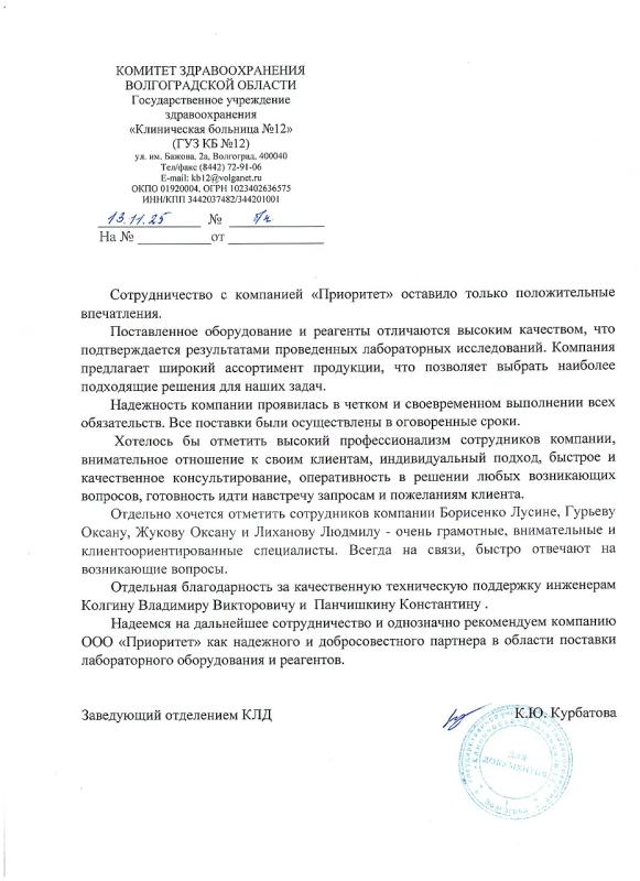Благодарственное письмо ГУЗ "Клиническая больница №12"