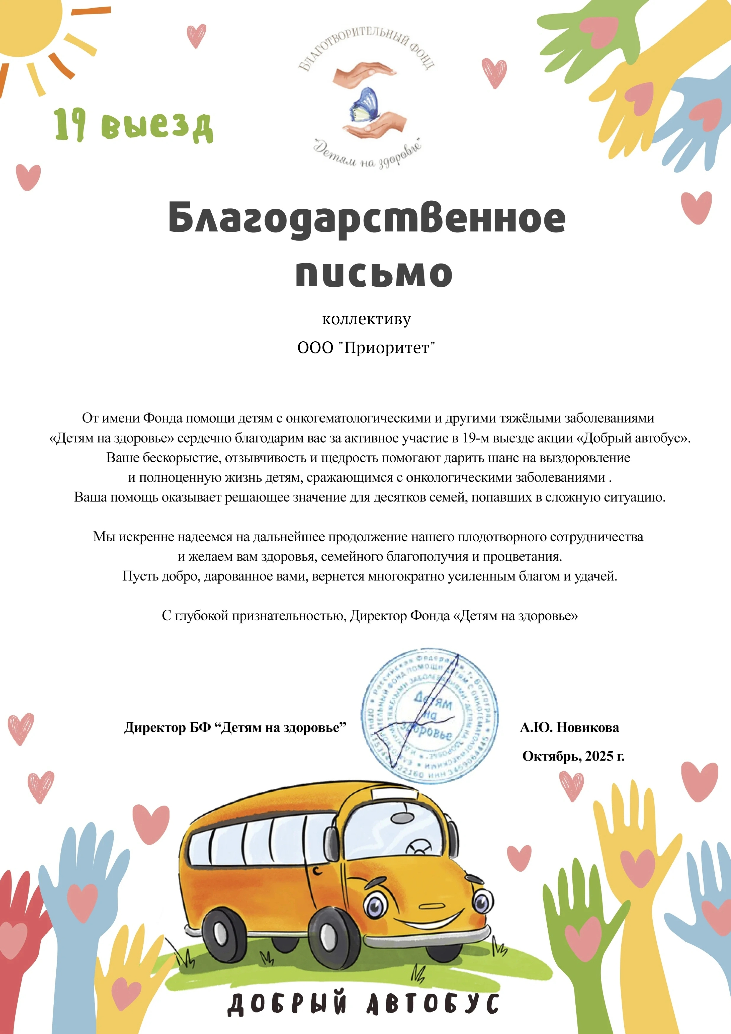 Компания "Приоритет" вновь принимает участие в акции "Добрый автобус"
